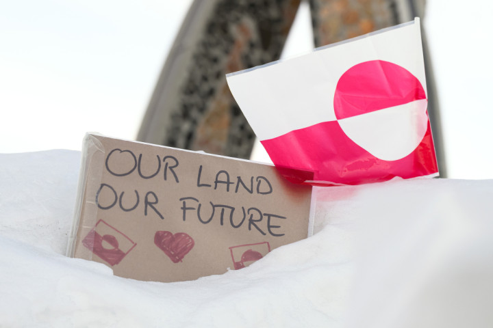 2025年3月30日,格林兰努克,一块写有“我们的土地,我们的未来”的标牌在雪地里与格林兰旗并立。